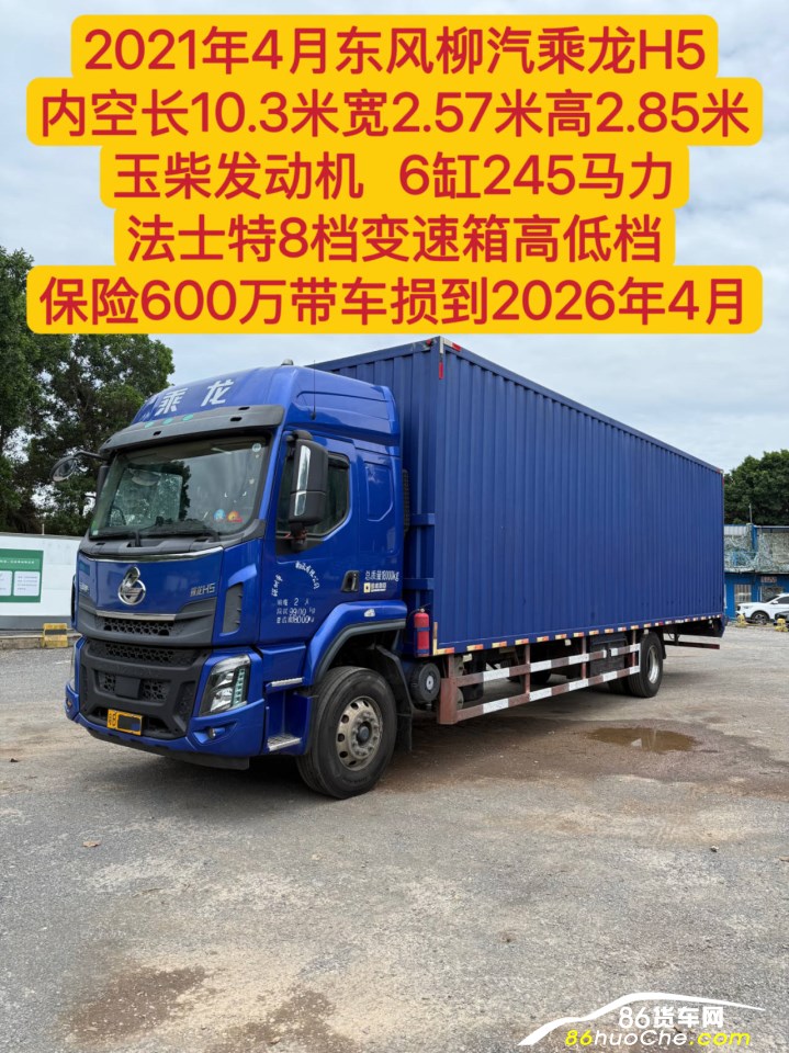深圳牌。东风柳汽乘龙h5。2021年4月上牌,单桥:内空箱长10.3米宽2.57米高2.85米。玉柴发动机,6缸245马力。法士特8档变速箱,带驻车空调加锂电池,6个轮胎刚落地 九成新。保险600万带车损跟年审同步到2026年4月。本车可过户,可按揭。